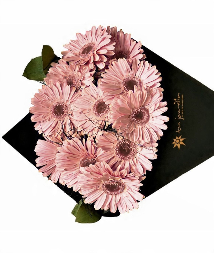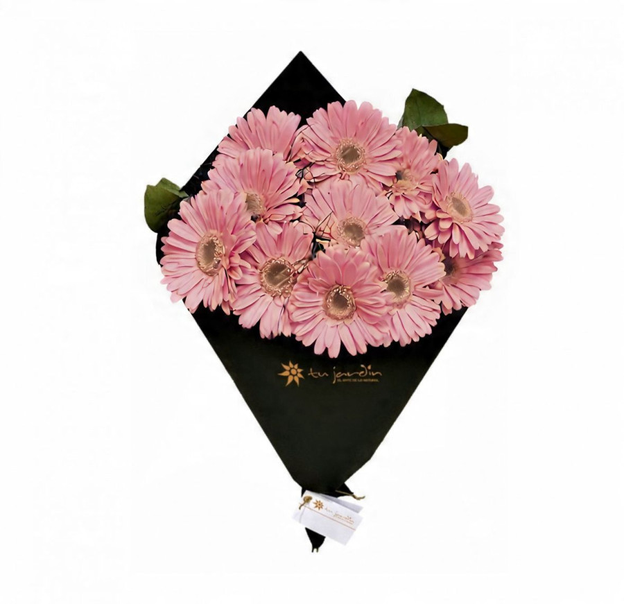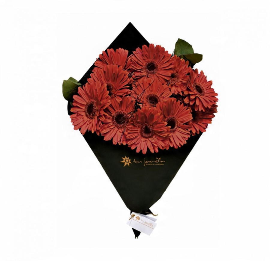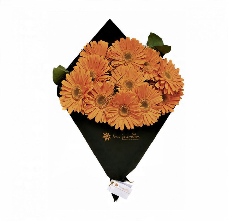 Cono de una docena de Gerberas, acompañadas con follaje. El tamaño del ramo es de 70 cm de alto por 60 cm de ancho.