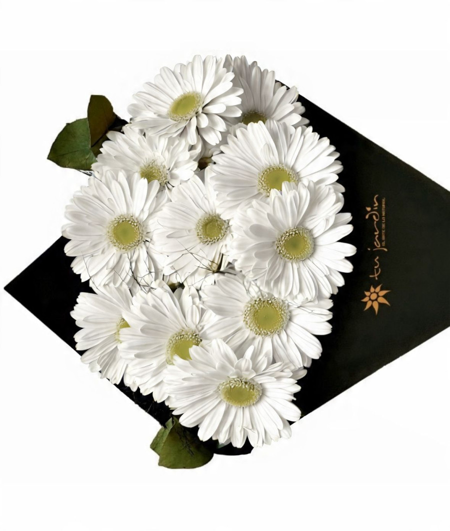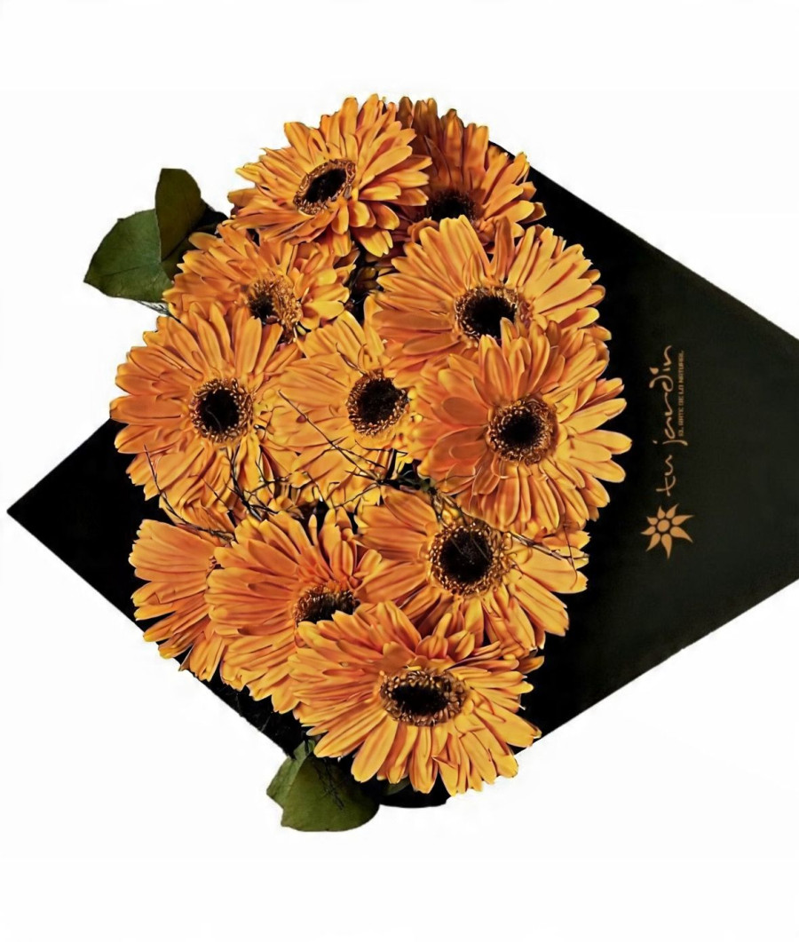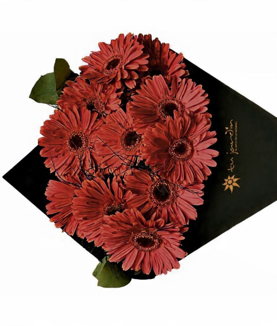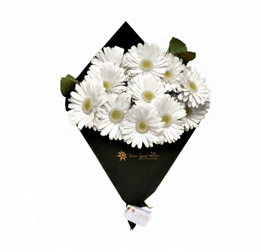 Cono de una docena de Gerberas, acompañadas con follaje. El tamaño del ramo es de 70 cm de alto por 60 cm de ancho.