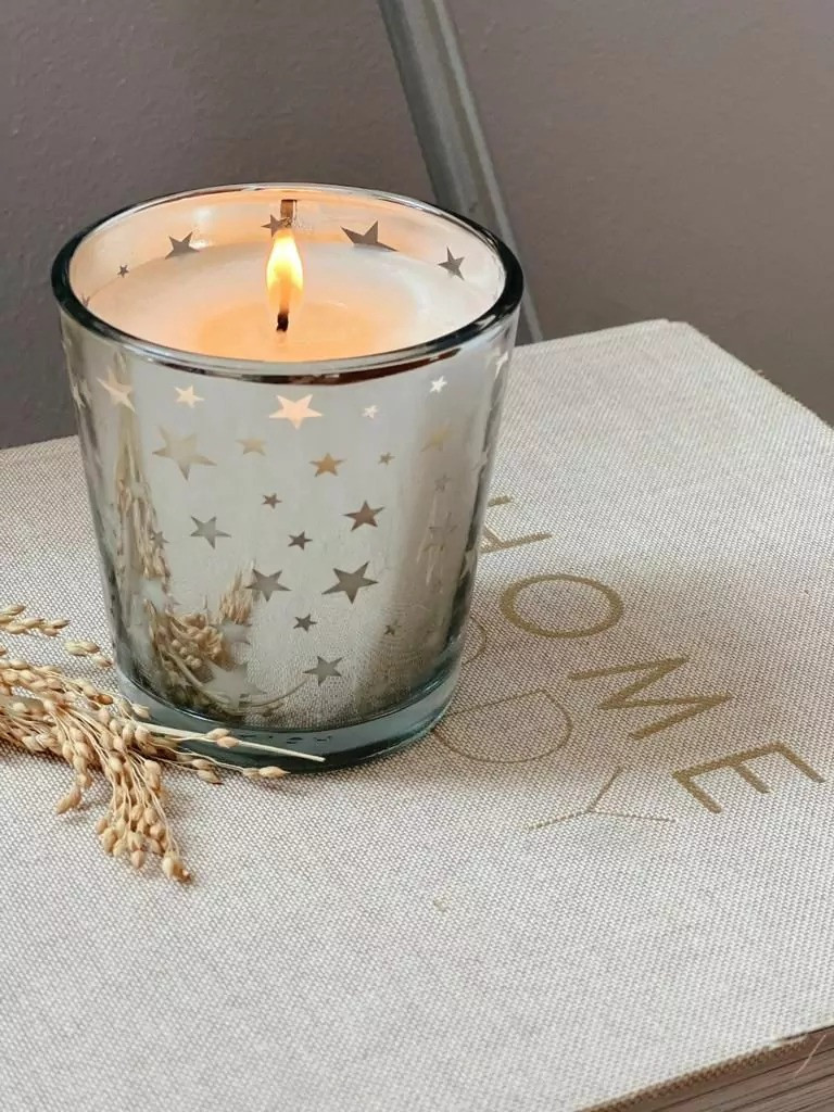 De la Línes CRYSTALVela 100% cera de Soja con fragancia a VERBENA.Vaso NEGRO OPACO TRABAJADO, con tapa de vidrio. Vaso importado hasta agotar stockMedidas 10,5x10,5