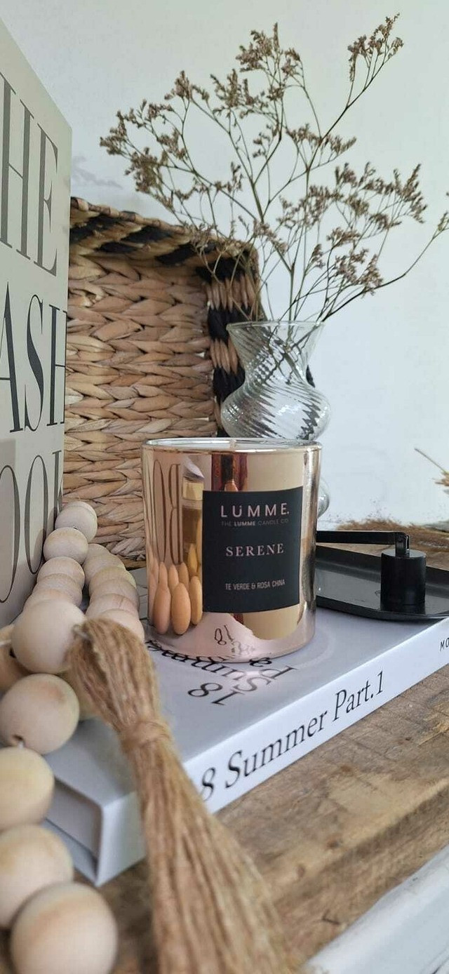 Este elegante vaso de vidrio en color oro rosa brillante con interior en plata es el complemento perfecto para tu hogar. Con unas medidas de 8x8,5 cm de alto, este objeto no solo es decorativo, sino que también presenta una fragancia exquisita de té verde y rosa china, ideal para crear un ambiente relajante.